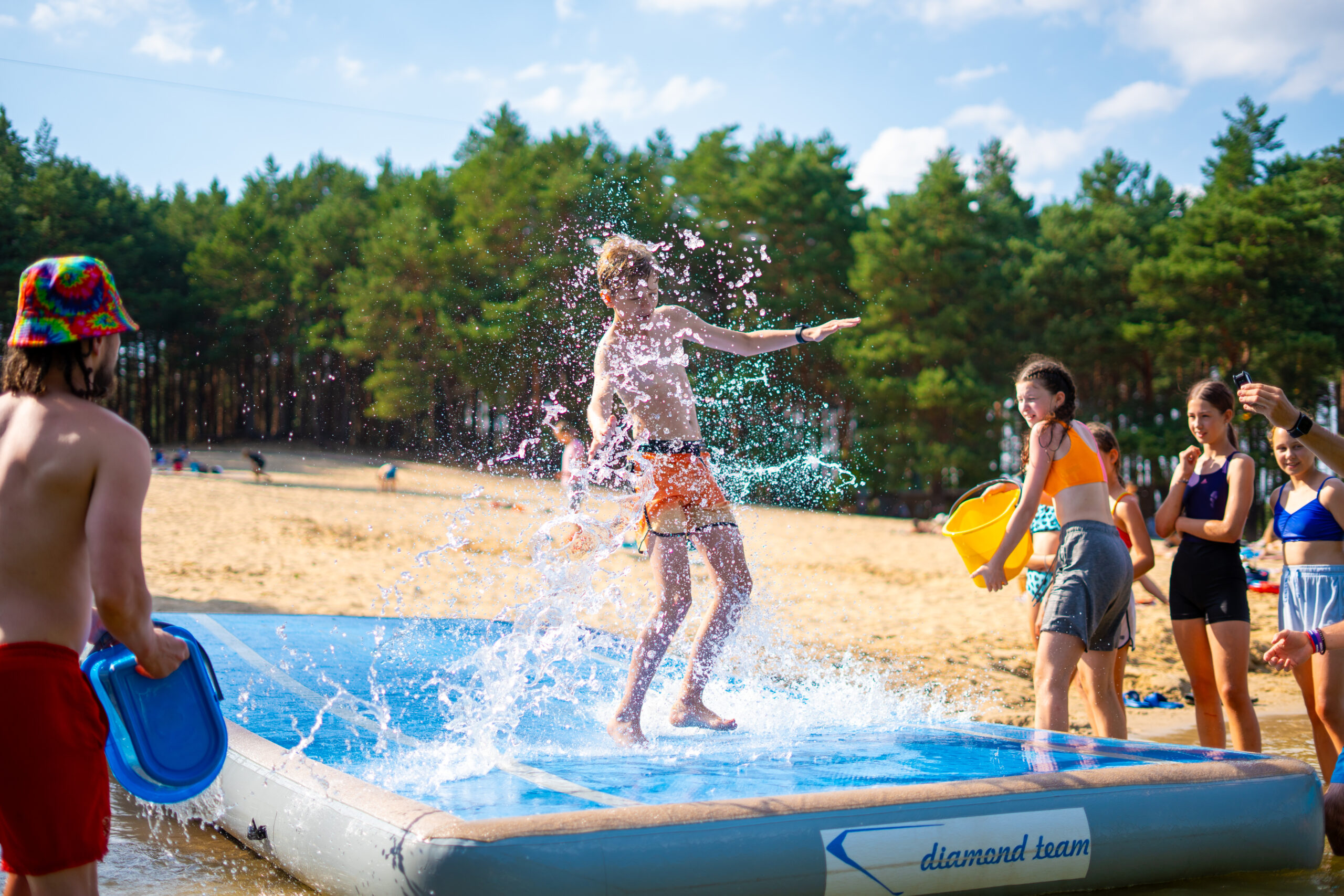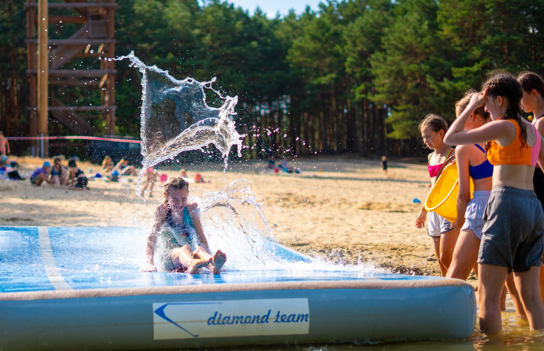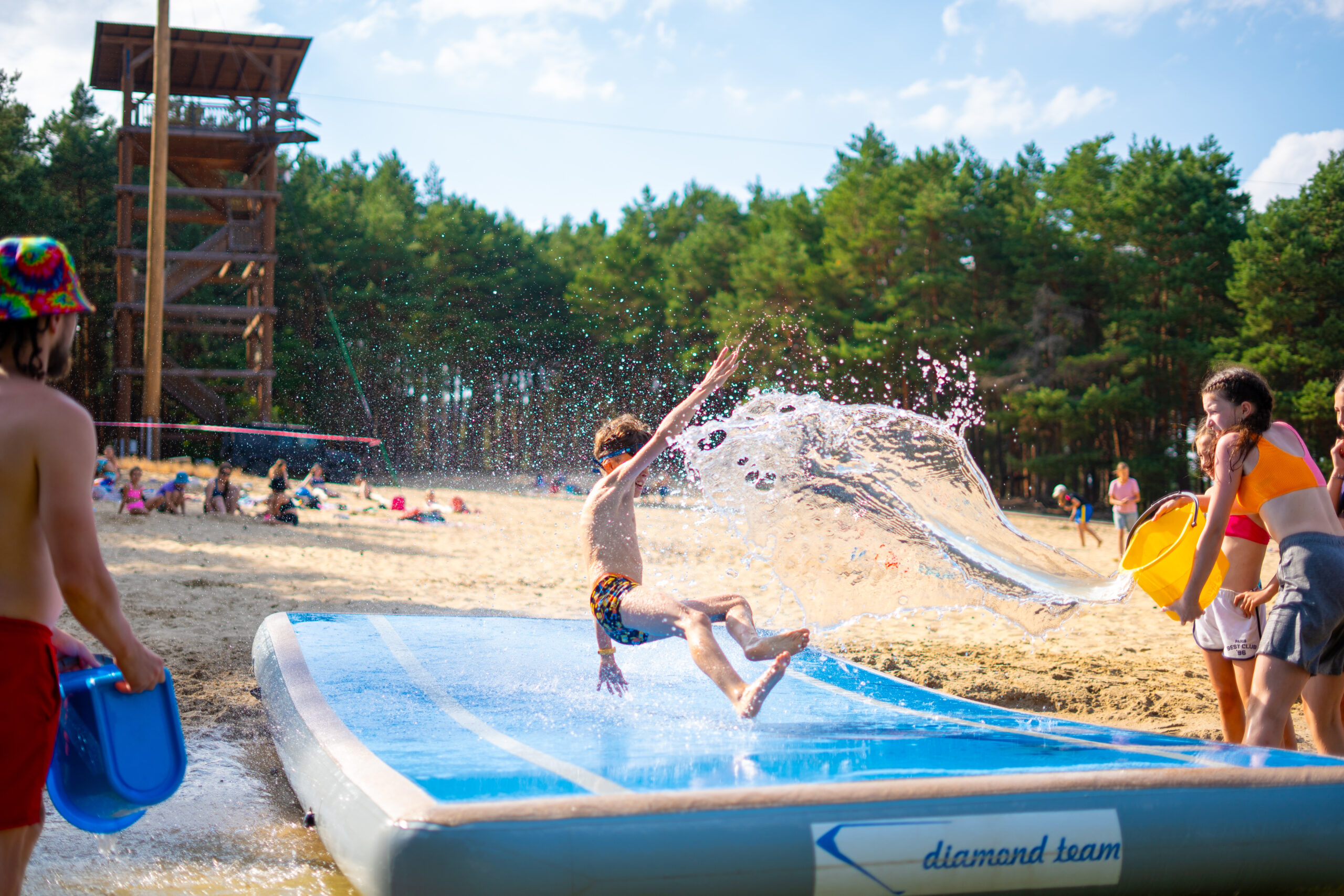 Podczas obozu organizujemy zjazdy do wody na airtracku. Jest to świetna zabawa która jest hitem wśród dzieciaków na naszych obozach.